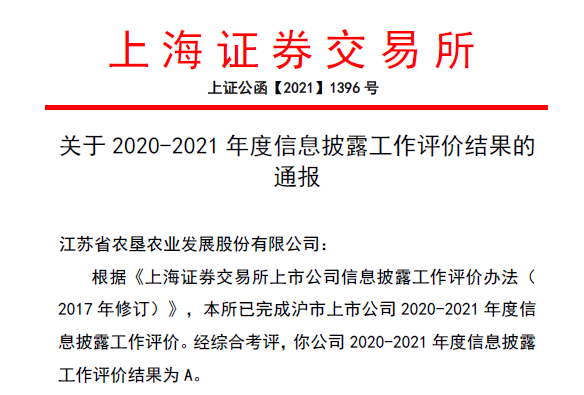 日前,上海證券交易所公布滬市主板上市公司2020-2021年度信息披露工作評價(jià)結果,蘇墾農發(fā)(股票代碼:601952)獲評最高等級“A”級,是蘇墾農發(fā)上市以來(lái)連續第二年獲得信息披露工作最高評級。