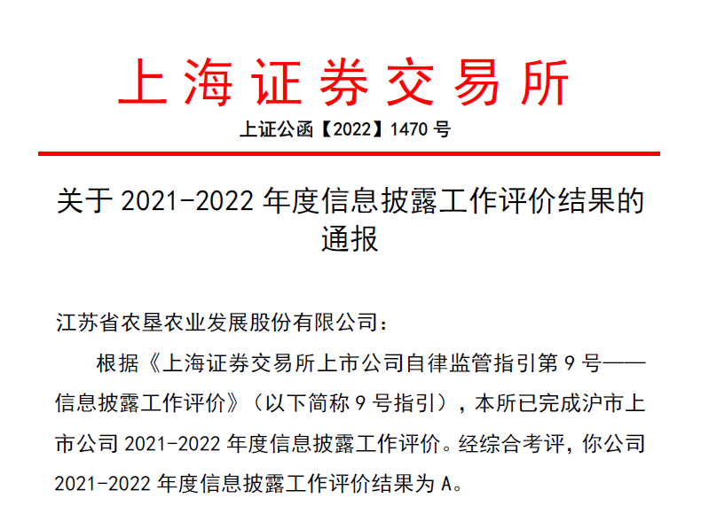 近日,上海證券交易所公布滬市主板上市公司2021-2022年度信息披露工作評價(jià)結果,蘇墾農發(fā)(股票代碼:601952)獲評最高等級“A”級,這是蘇墾農發(fā)連續第三年獲得信息披露工作最高等級評價(jià)。