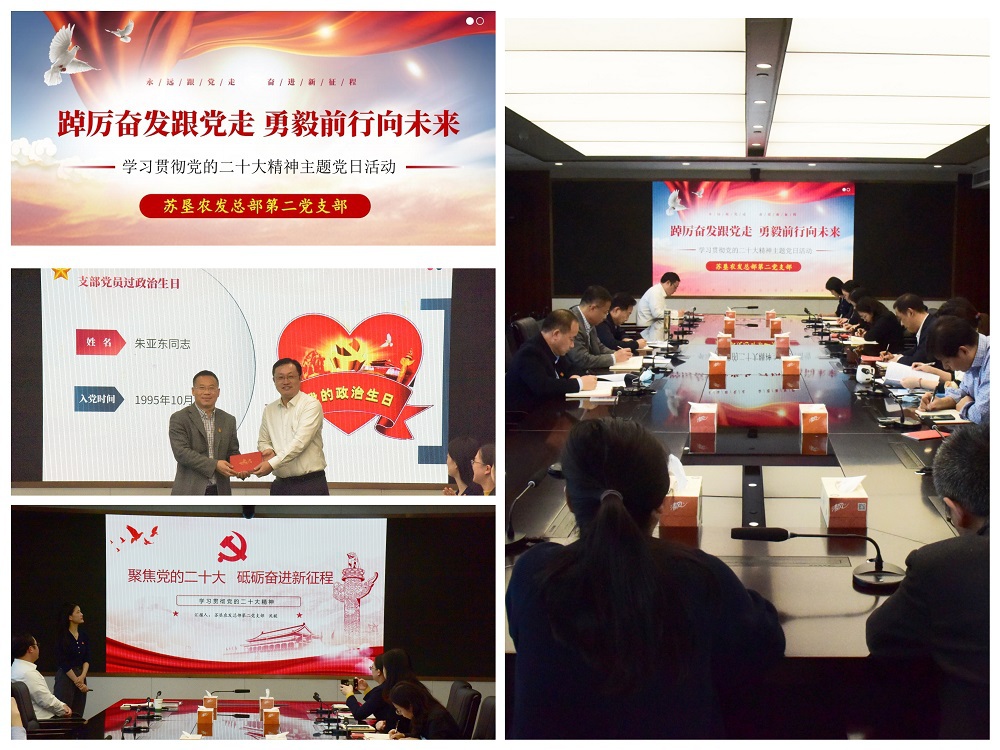 為深入學(xué)習貫徹黨的二十大精神,讓大會(huì )精神帶著(zhù)熱氣深入到每個(gè)黨員心中,10月25日,蘇墾農發(fā)總部第二黨支部開(kāi)展“踔厲奮發(fā)跟黨走 勇毅前行向未來(lái)”主題黨日活動(dòng)。