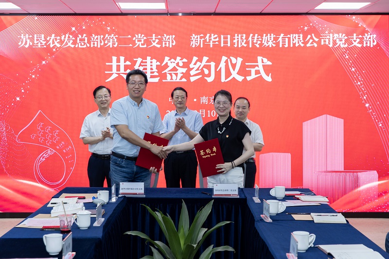 在新華日報傳媒有限公司黨支部書(shū)記、新華日報社(集團)編委、新華日報傳媒有限公司總經(jīng)理樊萬(wàn)朝和蘇墾農發(fā)黨委副書(shū)記、工會(huì )主席王進(jìn)強與黨委委員、紀委書(shū)記朱江勝見(jiàn)證下,雙方支部簽訂了共建協(xié)議。
