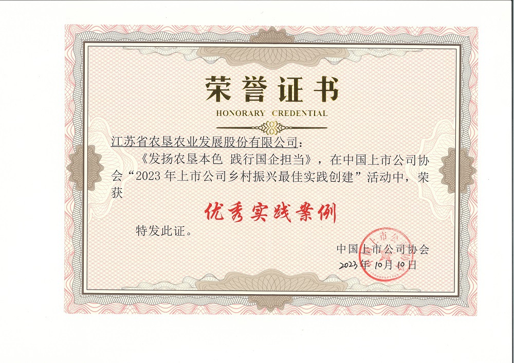 今年7月,中國上市公司協(xié)會(huì )分別開(kāi)展了“2023年公司治理最佳實(shí)踐案例評選活動(dòng)”和“2023年上市公司鄉村振興最佳實(shí)踐創(chuàng )建案例評選活動(dòng)”,由相關(guān)領(lǐng)域專(zhuān)家學(xué)者組成專(zhuān)家評審委員會(huì )對相關(guān)單位選送的實(shí)踐案例開(kāi)展嚴格遴選及多輪評審,最終評選出入選公司治理最佳實(shí)踐案例的上市公司100家,入選上市公司鄉村振興優(yōu)秀實(shí)踐案例的上市公司109家,兩項評選活動(dòng)蘇墾農發(fā)均成功入選。