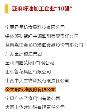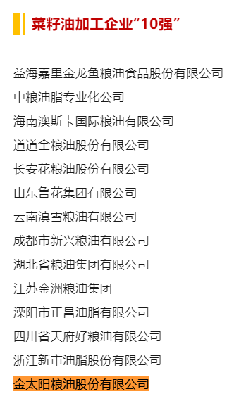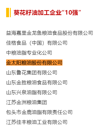 近日,中國糧食行業(yè)協(xié)會(huì )根據《關(guān)于進(jìn)行2024年度重點(diǎn)糧油企業(yè)和各省糧油加工業(yè)專(zhuān)項調查的通知》(中糧協(xié)〔2024〕2號),組織行業(yè)專(zhuān)家開(kāi)展了2023年度重點(diǎn)糧油企業(yè)專(zhuān)項調查,按照產(chǎn)品銷(xiāo)售收入、產(chǎn)量、產(chǎn)能、利稅、利潤等指標綜合審定,公示了2023年度重點(diǎn)糧油企業(yè)專(zhuān)項調查結果。金太陽(yáng)糧油股份有限公司再度入選食用油加工企業(yè)“50強”、玉米油加工企業(yè)“10強”、稻米油加工企業(yè)“10強”、葵花籽油加工企業(yè)“10強”、亞麻籽油加工企業(yè)“10強”等5項榜單,首次入選菜籽油加工企業(yè)“10強”榜單。