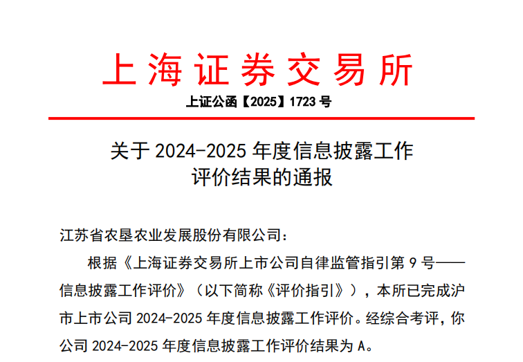 近日,上海證券交易所公布滬市主板上市公司2024-2025年度信息披露工作評價(jià)結果,蘇墾農發(fā)(股票代碼:601952)再次獲評最高等級“A”級。至此,公司已連續六年蟬聯(lián)上交所信息披露最高評級。